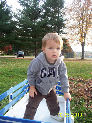 The Reed family went to Thistleberry Farms on Sunday to celebrate fall and to have a little fun with Jack. It was SO MUCH FUN! There was a petting zoo, a cow train, a big jumping platform, a corn maze, a super slide, and a pumpkin patch! Jack enjoyed the super slide the most. It was pretty fast so we had to take him down on our laps. Every time he came through the tunnel with a huge smile on his face - so glad I got it on video on my Flip! He kept pointing and gesturing toward the slide so we took him on it four times! Here are some pictures from our fun family day...